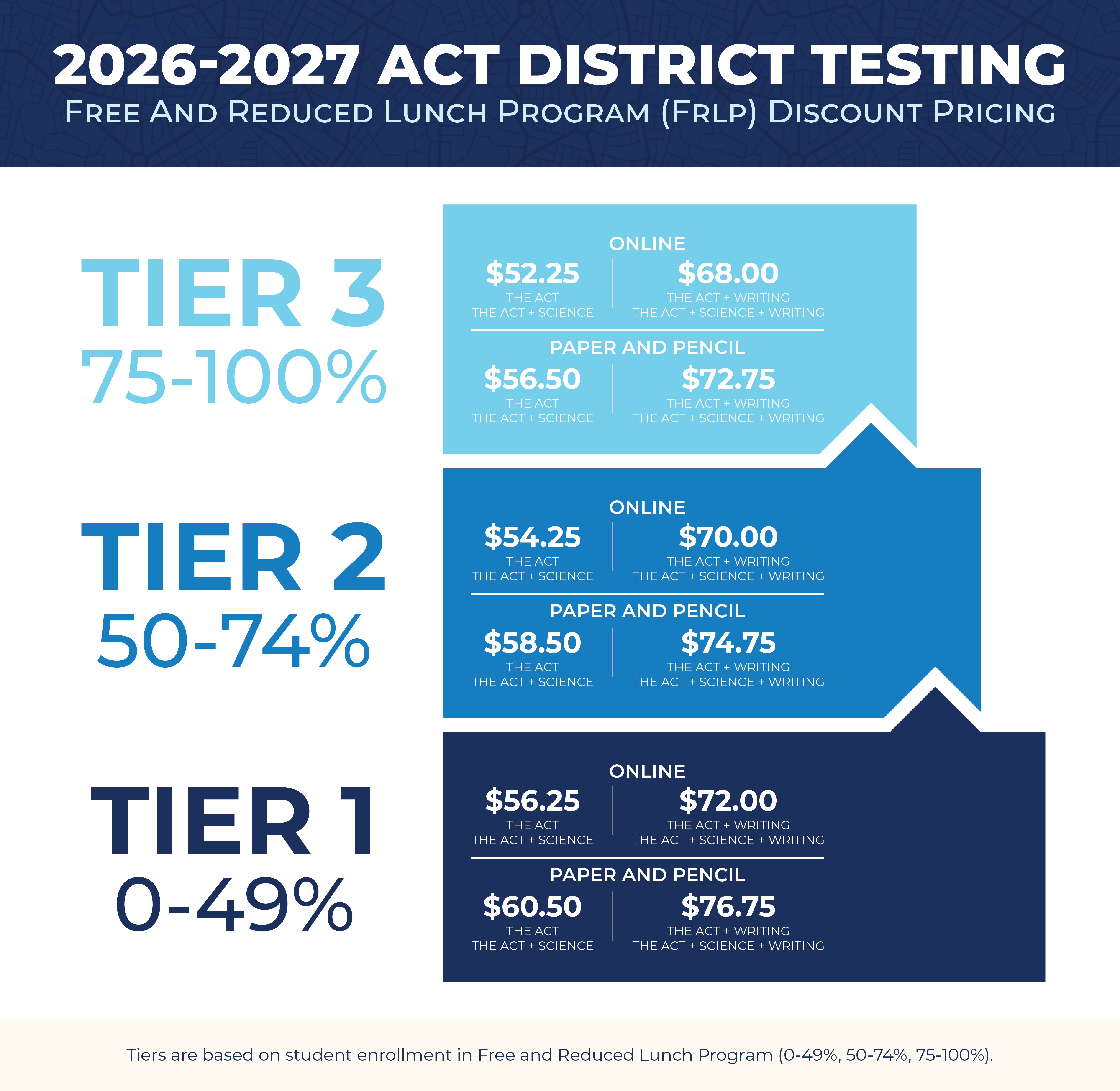 Additional tiered discounts are available for districts with 50-100% of students in the Free and Reduced Lunch Program (FRLP). View pricing infographic.