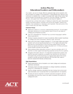 Specific steps education and policy leaders can take to help improve college and workforce readiness of high school students. (PDF; 37KB, 2 pages) ...